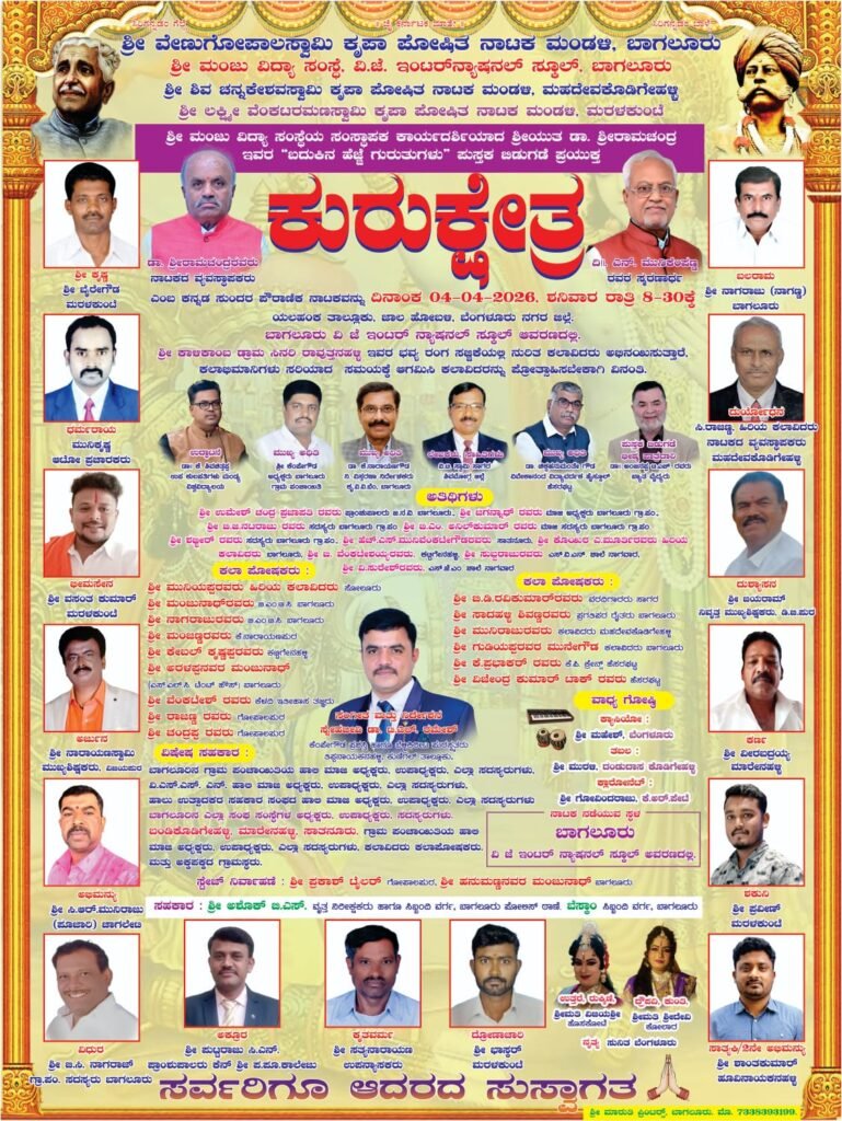 ಶಿವಮೊಗ್ಗ-ಏ:3/ ಬೆಂಗಳೂರು ಯಲಹಂಕ ತಾಲ್ಲೂಕಿನ ಬಾಗಲೂರಿನ ವಿಜಯ ಜ್ಯೋತಿ ಇಂಟರ್ನ್ಯಾಷನಲ್ ಶಾಲಾ ಮೈದಾನದಲ್ಲಿ ಏಪ್ರಿಲ್ 4 ರಂದು ಶನಿವಾರ ರಾತ್ರಿ 8ಕ್ಕೆ ಹಿರಿಯ ಹಾಗೂ ಗಣ್ಯ ಕಲಾವಿದರಿಂದ ಕುರುಕ್ಷೇತ್ರ ಪೌರಾಣಿಕ ನಾಟಕ ಪ್ರದರ್ಶನವಾಗಲಿದೆ.