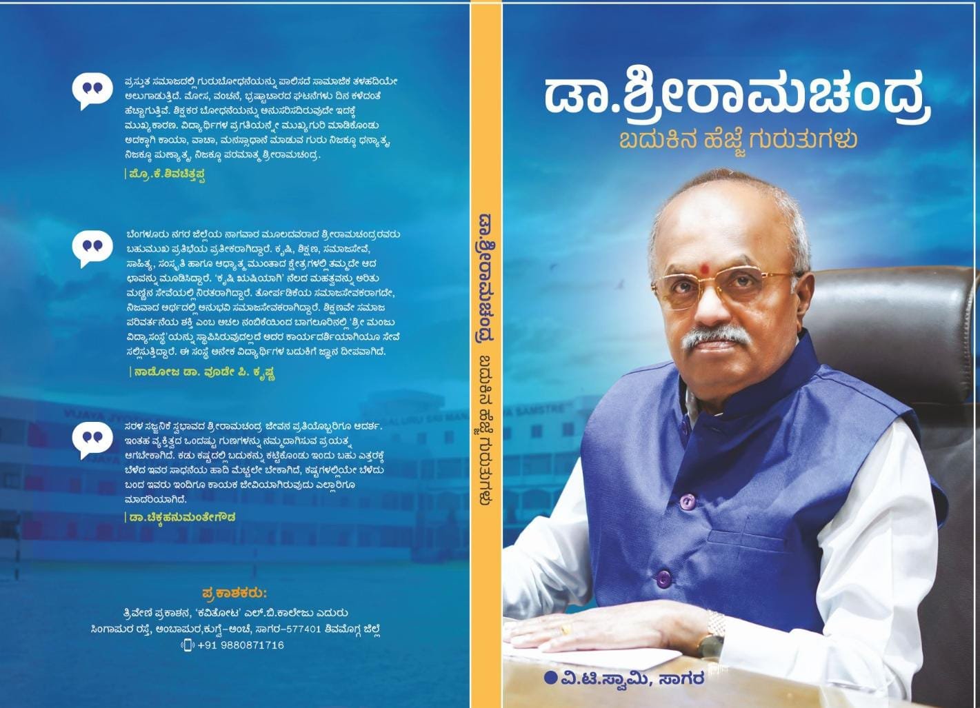 ಡಾ.ಶ್ರೀರಾಮಚಂದ್ರ ಸ್ನೇಹಬಳಗ ಹಾಗೂ ವಿಜಯ ಜ್ಯೋತಿ ಸಮೂಹ ಶಿಕ್ಷಣ ಸಂಸ್ಥೆ ಸಹಯೋಗದೊಂದಿಗೆ ವಿ.ಟಿ.ಸ್ವಾಮಿ ಸಾಗರ ಇವರು ರಚಿಸಿದ ಶಿಕ್ಷಣ, ಸಾಹಿತ್ಯ, ಸಾಂಸ್ಕೃತಿಕ ರಾಯಬಾರಿ ಹಾಗೂ ಕನ್ನಡ ಚಳುವಳಿ ಹೋರಾಟಗಾರ ಡಾ.ಶ್ರೀರಾಮಚಂದ್ರ ಅವರ ಜೀವನ ಸಾಧನೆ ಕುರಿತು ಪುಸ್ತಕ ಬಿಡುಗಡೆ ಕಾರ್ಯಕ್ರಮವನ್ನು ಆಯೋಜಿಸಲಾಗಿದೆ.