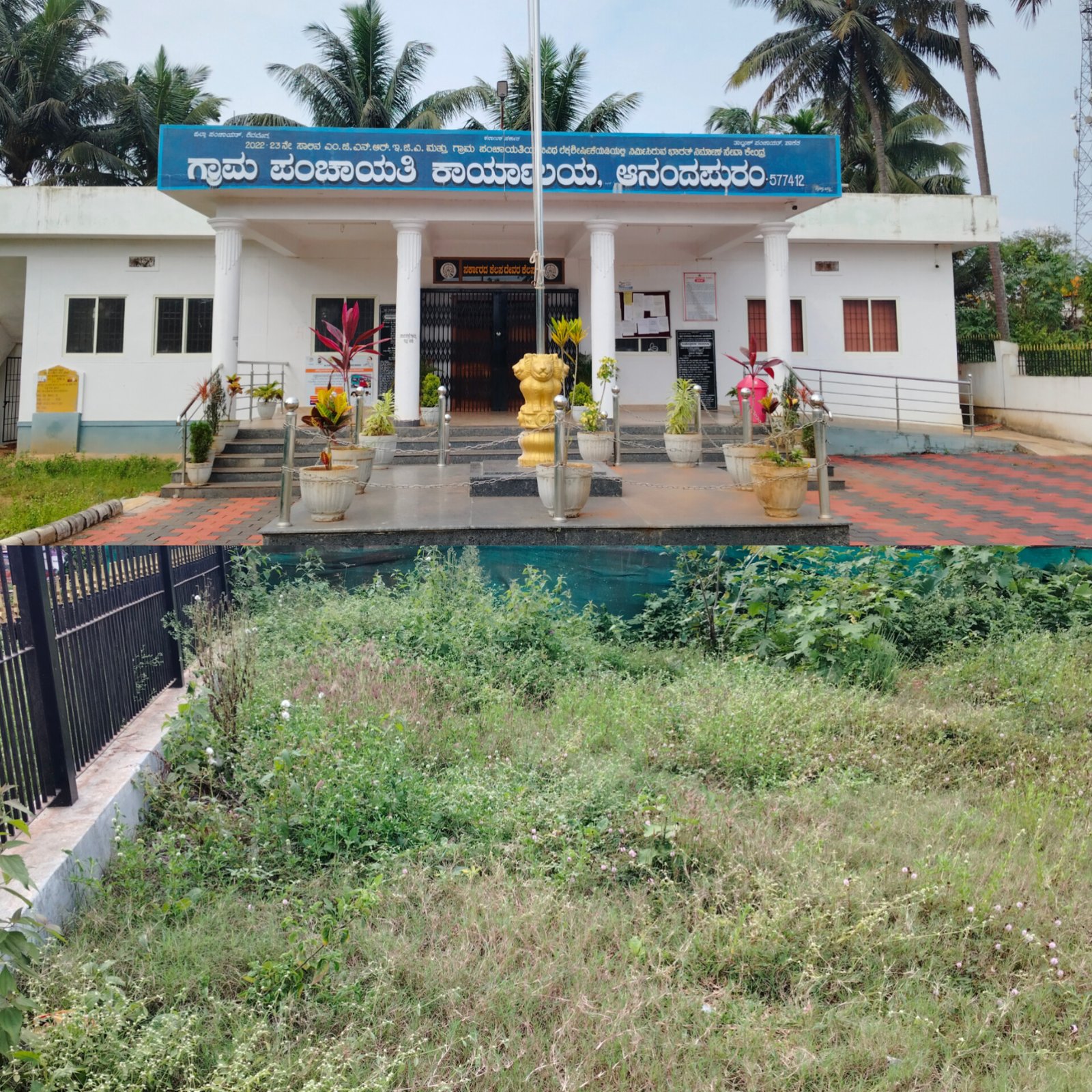 ಗ್ರಾಮ ಪಂಚಾಯಿತಿ ಮುಂಭಾಗ ಆವರಣದಲ್ಲಿ ಬೆಳೆದ ಗಿಡಗಂಟಿಗಳು.
