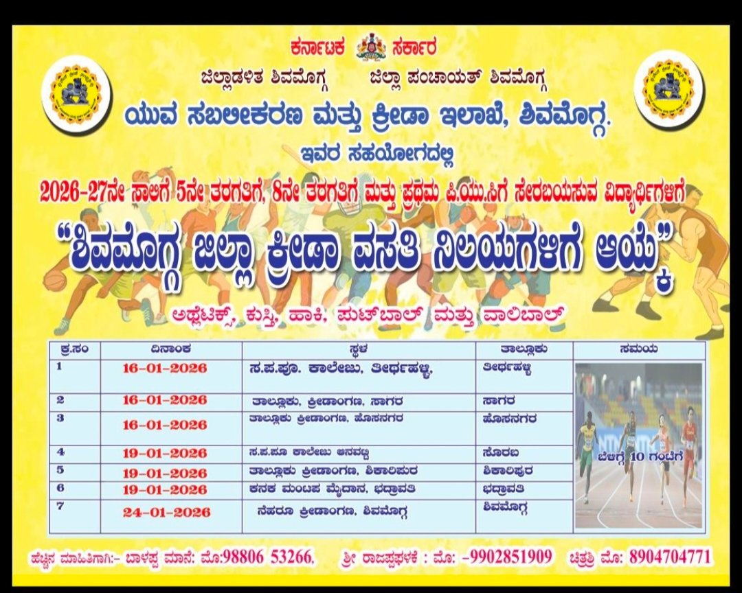 ಶಿವಮೊಗ್ಗ.ಜ.14 : ಯುವ ಸಬಲೀಕರಣ ಮತ್ತು ಕ್ರೀಡಾ ಇಲಾಖೆಯಿಂದ ನಿರ್ವಹಿಸುತ್ತಿರುವ ಜಿಲ್ಲಾ ಕ್ರೀಡಾಶಾಲೆಗೆ 2026-27 ನೇ ಸಾಲಿನ ಪ್ರವೇಶಕ್ಕೆ ಸಂಬಂಧಿಸಿದಂತೆ ಜಿಲ್ಲೆಯ ಎಲ್ಲ ತಾಲ್ಲೂಕುಗಳಲ್ಲಿ ತಾಲ್ಲೂಕು ಮಟ್ಟದ ಆಯ್ಕೆಯನ್ನು ನಡೆಸಲಾಗುವುದು