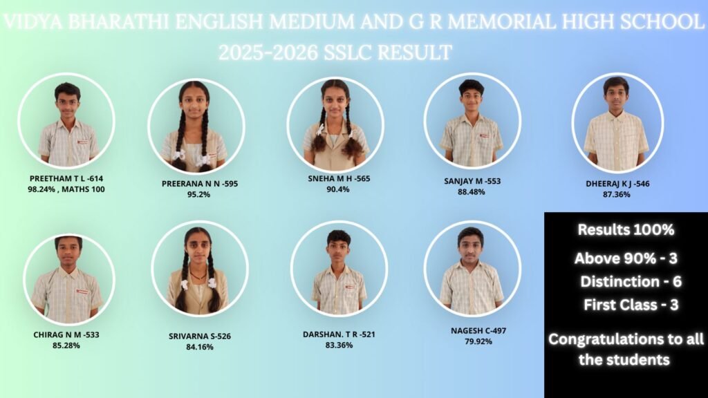 ಸಾಗರ: ಆನಂದಪುರ ಸಮೀಪದ ಗೌತಮಪುರದ ಸ್ಥಳೀಯ ವಿದ್ಯಾ ಭಾರತಿ ಇಂಗ್ಲಿಷ್ ಮೀಡಿಯಂ ಮತ್ತು ಜಿ.ಆರ್ ಮೆಮೋರಿಯಲ್ ಪ್ರೌಢಶಾಲೆಯ ಪಾಲಿಗೆ ಈ ಬಾರಿಯ ಎಸ್.ಎಸ್.ಎಲ್.ಸಿ ಫಲಿತಾಂಶ ಅವಿಸ್ಮರಣೀಯವಾಗಿದೆ.