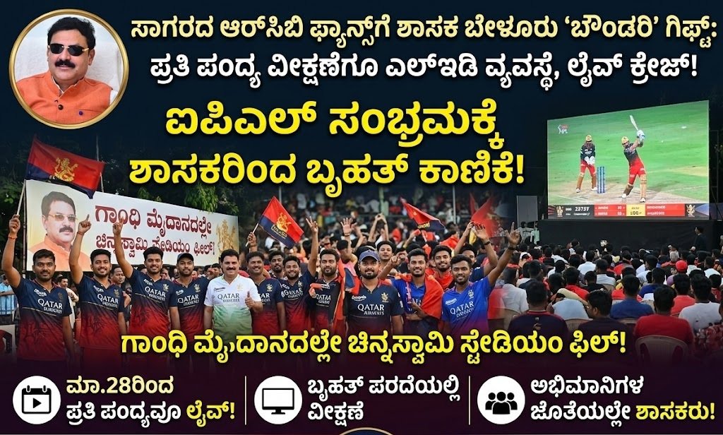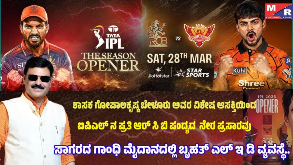 ಸಾಗರ: ಕ್ರಿಕೆಟ್ ಪ್ರೇಮಿಗಳ ಬಹುನಿರೀಕ್ಷಿತ ಐಪಿಎಲ್ 2026ರ ಸೀಸನ್ ಓಪನರ್ ಪಂದ್ಯಕ್ಕೆ ದಿನಗಣನೆ ಆರಂಭವಾಗಿರುವಂತೆಯೇ, ಸಾಗರ ನಗರದ ಕ್ರಿಕೆಟ್ ಅಭಿಮಾನಿಗಳಿಗೆ ಶಾಸಕ ಗೋಪಾಲಕೃಷ್ಣ ಬೇಳೂರು ಅವರು ಭರ್ಜರಿ ಸಿಹಿ ಸುದ್ದಿ ನೀಡಿದ್ದಾರೆ.